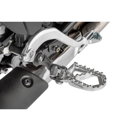 Die Touratech Works Fußrasten wurden speziell an der Aufnahme verstärkt und sind somit deutlich widerstandsfähiger gegen Aufschläge. Auch optisch sind die Works Produkte ein Highlight. Gestrahltes Edelstahl mit einer speziellen Laserbeschriftung zeichnet dieses Produkt aus und zeigt auch optisch die edle Herkunft aus dem Extremenduro Sport.